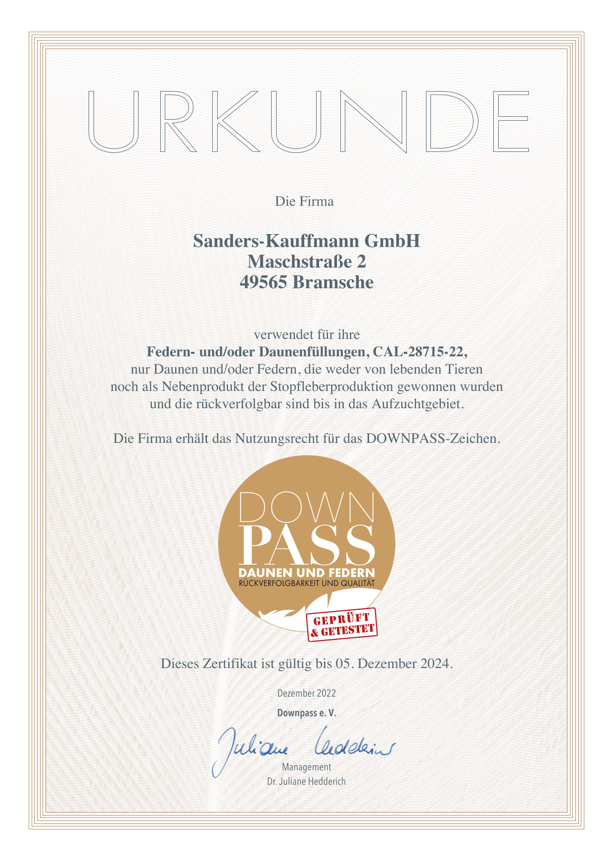 Wir beziehen unsere Gänsedaunen und Gänsefedern ausschließlich von einem Hersteller, der das DOWNPASS Zertifikat trägt. Das DOWNPASS Zertifikat steht für hohe Qualität und strenge ethische Standards in der Daunen- und Federnproduktion. Es garantiert, dass die Daunen und Federn aus artgerechter Haltung stammen und dass der gesamte Produktionsprozess unter Berücksichtigung des Tierschutzes erfolgt. Die Rückverfolgbarkeit und Transparenz entlang der gesamten Lieferkette werden durch regelmäßige Audits und Kontrollen sichergestellt. Mit dem DOWNPASS Zertifikat können Sie sicher sein, dass unsere Daunendecken nicht nur hochwertig, sondern auch ethisch verantwortungsvoll produziert sind.