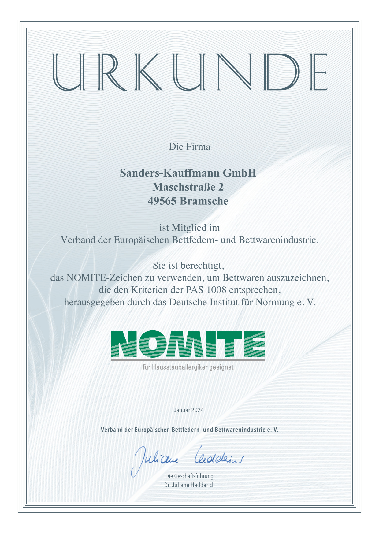 Zusätzlich tragen die verwendeten Materialien das NOMITE Zertifikat, welches bestätigt, dass sie auch für Hausstaubmilbenallergiker geeignet sind. Das NOMITE Zeichen signalisiert, dass die Decken dank ihrer dichten Inletts für Allergiker unbedenklich sind, da sie das Eindringen von Hausstaubmilben verhindern. Dieses Zertifikat ist besonders wichtig für Menschen mit Allergien, die dennoch den Komfort und die Wärme einer Daunendecke genießen möchten. Die Kombination aus hochwertigen Materialien und der NOMITE Zertifizierung sorgt dafür, dass unsere Decken hygienisch und allergikerfreundlich sind.