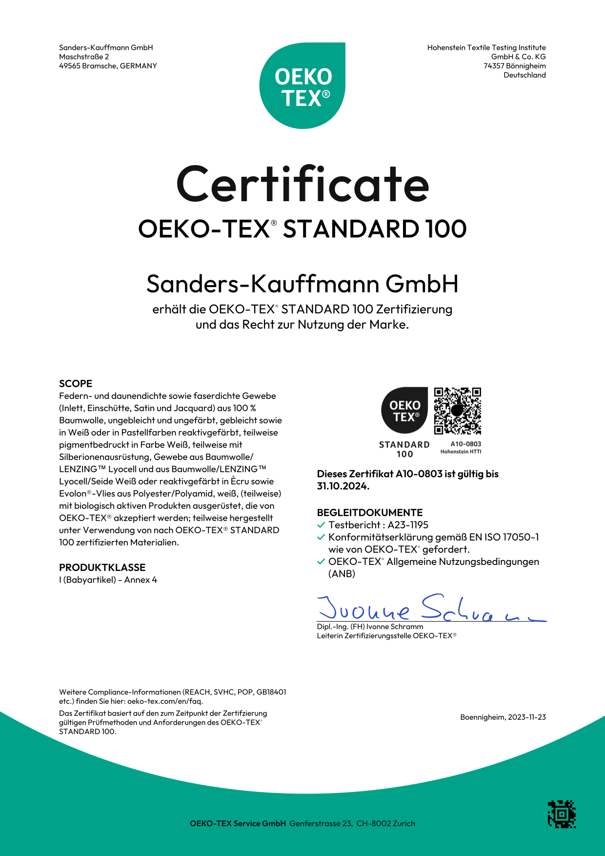 Unsere Daunendecken werden ausschließlich aus Materialien hergestellt, die die OEKO-TEX® STANDARD 100 Zertifizierung tragen. Dieses international anerkannte Zertifikat stellt sicher, dass alle verwendeten Materialien auf Schadstoffe geprüft wurden und somit gesundheitlich unbedenklich sind. Der STANDARD 100 von OEKO-TEX® ist ein umfassendes, unabhängiges Prüf- und Zertifizierungssystem für textile Roh-, Zwischen- und Endprodukte in allen Verarbeitungsstufen sowie für verwendete Zubehörmaterialien. Diese Zertifizierung garantiert, dass unsere Daunendecken höchsten Sicherheits- und Umweltstandards entsprechen.